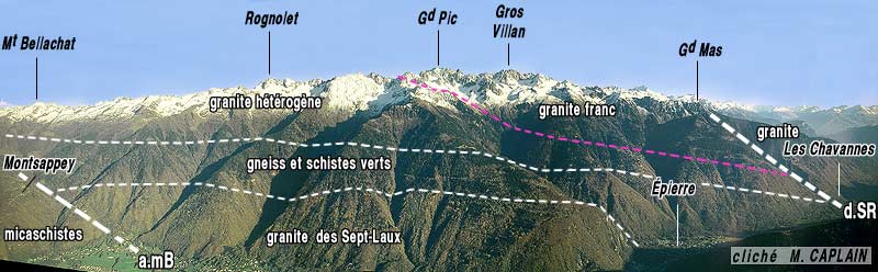 sur toute sa longueur par un autre pluton granitique, lequel se prolonge au sud par celui de Saint-Colomban (avant de se biseauter symétriquement vers le sud, contre la faille orientale de Belledonne, à l'extrémité NE du massif des Sept-Laux).