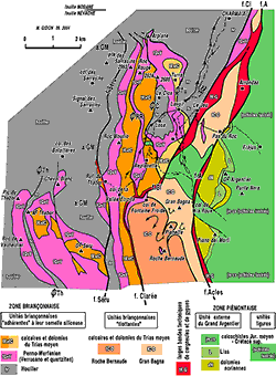 Carte géologique très simplifiée des confins de la Maurienne et du Briançonnais oriental dans la vallée du Charmaix (sud-ouest de la station de Val Fréjus) et la Vallée Étroite (nord-ouest de Bardonnecchia). La zone briançonnaise est séparée de la zone piémontaise par le couloir tectonique d'Arrondaz. Ce dernier est limité du côté ouest par la faille de La Clarée (= faille du Jeu) et à l'est par la faille des Acles (= faille du Pas du Roc), toutes deux presque verticales. De part et d'autre de ces failles et entre elles affleurent des unités qui sont des fragments des nappes qui ont été empilées, puis plissées et renversées, avant d'avoir été sectionnées par les failles verticales. Le couloir tectonique d'Arrondaz représente un simple