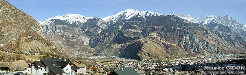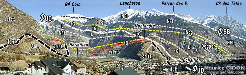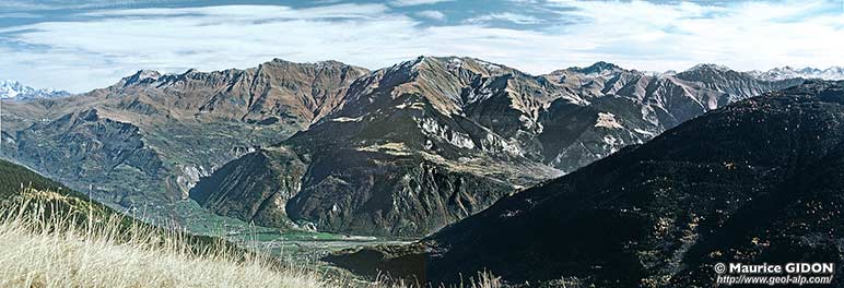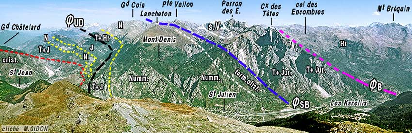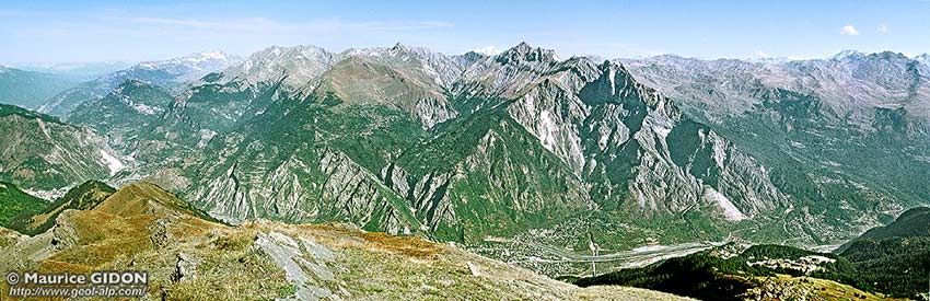 ![]() Panorama de la rive droite de la Maurienne, entre Saint-Michel et Saint-Jean de Maurienne vu du sud, depuis le sommet de Casse-Massion (au dessus des Karellis). En rouge l'interface cristallin - sédimentaire (base du Trias). En rouge l'interface