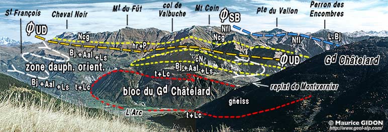 ![]() Panorama de la rive droite de la Maurienne, entre la vallée du Bugeon et le défilé de Pontamafrey vu du sud-ouest, depuis les crêtes du Grand Jarnalet (rive gauche de la vallée des Villards). En rouge la surface de la pénéplaine anté-triasique ; en jaune la surface de transgression du Tertiaire. s.cC = synclinal de la Chal de Chaussy : son coeur nummulitique (cerné de tirets jaunes) forme le ressaut qui soutient le replat de Montpascal. (pour une analyse plus détaillée de la partie gauche voir la page vallée du Bugeon) |