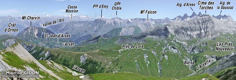 Les grès et schistes de la zone ultradauphinoise (flysch des Aiguilles d'Arves) ne donnent pas, au nord d'Albiez (dans la crête de Casse Massion) des reliefs plus hardis que sur la rive droite de la Maurienne. Par contre plus au sud la base de ce flysch s'enrichit d'une puissante masse de conglomérats qui donnent de forts abrupts qui culminent avec les Aiguilles d'Arves. Les couches y montrent pourtant la même structure simple, s'apparentant à celle d'un crêt dont l'abrupt regarde la vallée de l'Arvan, tandis que son revers s'enfonce vers l'est sous les terrains des zones plus internes, avant d'atteindre la vallée de Valloire.