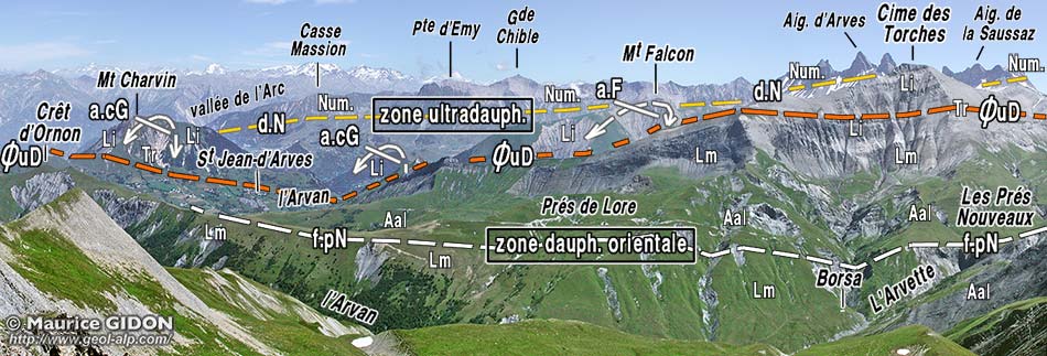La surface de chevauchement qui sépare la zone dauphinoise de la zone ultradauphinoise est jalonnée par une bande de gypses parfois épaisse. Elle passe par Saint-Jean de Maurienne et s'élève progressivement, en biais, à flanc de versant vers le sud pour franchir la branche amont de la vallée de l'Arvan à Saint-Jean d'Arves. Plus au sud elle se raccorde, dans le versant occidental du Pic du Mas de la Grave, aux surfaces de chevauchement jumelles de La Grave et des Hières, qui sont des imbrications au sein de la couverture orientale du bloc cristallin jurassique d'En-Paris (mais il est exclu de coordonner de façon directe ces chevauchements avec celui de la Meije, dont l'orientation et l'âge sont différents).