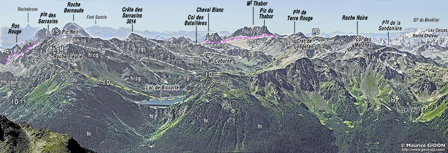N.B.2 - le houiller moyen, très développé sous le lac de Bissorte et dans le soubassement de la Pointe des Sarrasins, diminue progressivement d'épaisseur le long du revers est de la crête et fait finalement défaut sous le Thabor : ceci est dû à une discordance* stratigraphique du Permo-Trias (qui débute ici avec le Verrucano).