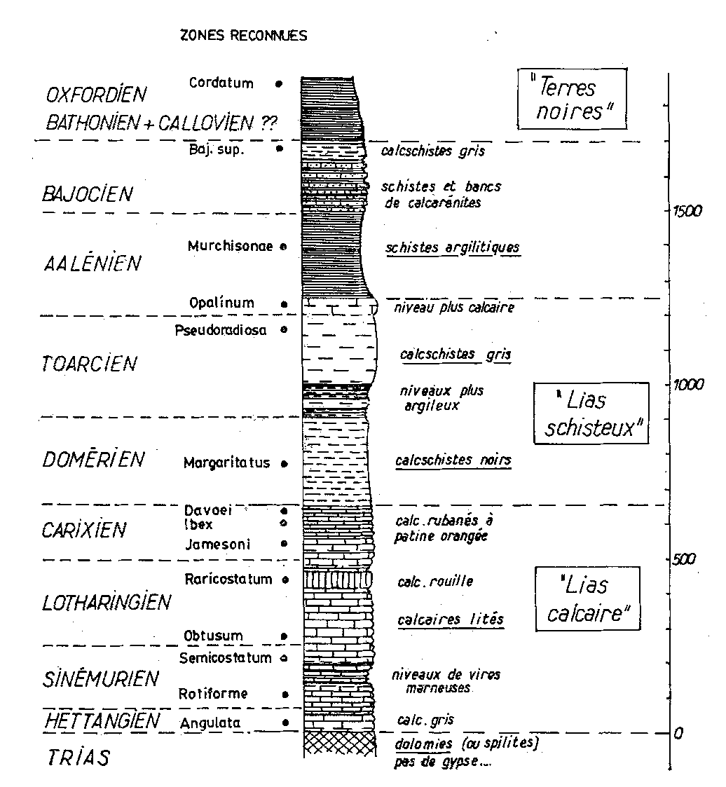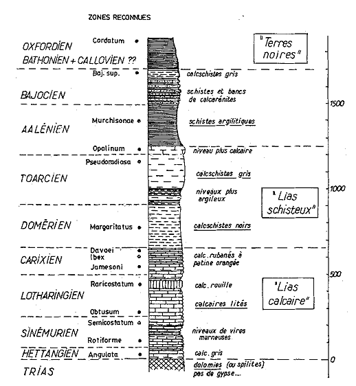 Dans l'ensemble la zone dauphinoise orientale de Maurienne présente une série stratigraphique qui se distingue peu de celle de l'Oisans, mais où les termes inférieurs (Lias calcaire) sont souvent assez minces par rapport aux termes supérieurs (Lias schisteux et Dogger)...