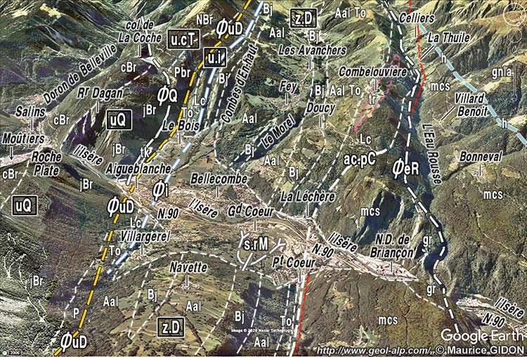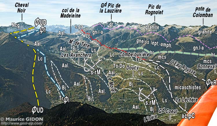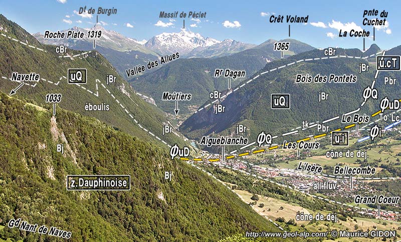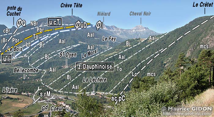 ![]() La rive gauche de la vallée de l'Isère à la Léchère, vue du NE, depuis le village de La Conche. ØQ = chevauchement de l'unité du Quermoz ; u.cT = unité de Crève Tête ; ØUD = surface de chevauchement de la zone ultra-dauphinoise ; ØI = chevauchement de l'écaille intercalaire (u.I) entre la zone dauphinoise et la zone ultradauphinoise ; s.rM = synclinal du Roc Marchand ; ac.pC = accident de Petit-Cœur = cassure limitant du côté oriental le bloc de socle cristallin de Belledonne. "jBr" = brèches jurassiques , "cBr" = brèches crétacées , "NBr" = brèches nummulitiques ; "Pbr" = brèches à matériel permien (grès et pélites versicolores) ; "mcs" = micaschistes. |