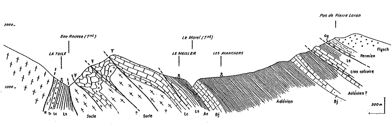 ![]() Coupe W-E à la latitude des Avanchers (extrait de Barféty J.C., BRGM 1985) l'orientation de cette coupe est inverse de celle du cliché ci-dessus. Noter l'attitude sub-verticale du chevauchement de l'Eau Rousse. La lame de calcaires bajociens dessinée dans le lit du Morel au centre de la coupe représente le cœur de l'anticlinal du Roc Marchand. Cette coupe met bien en évidence la différence de constitution entre les deux flancs de ce pli : succession peu épaisse à l'ouest et très forte dilatation des affleurements d'Aalénien à l'est : il s'agit sans doute là d'une disposition originelle sédimentaire due au remplissage d'une dépression à fond incliné vers l'est. |