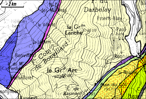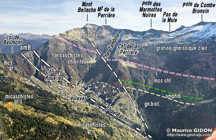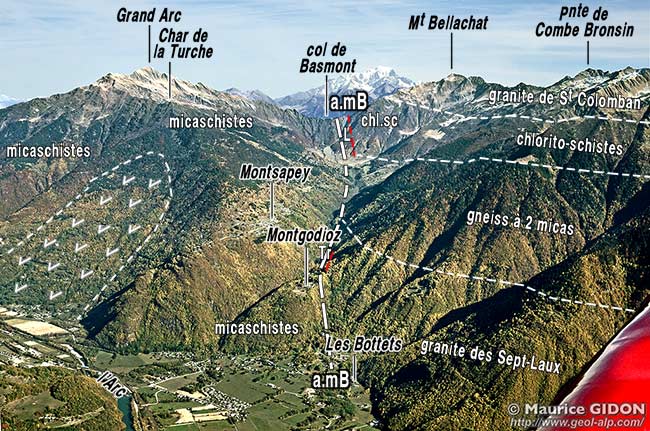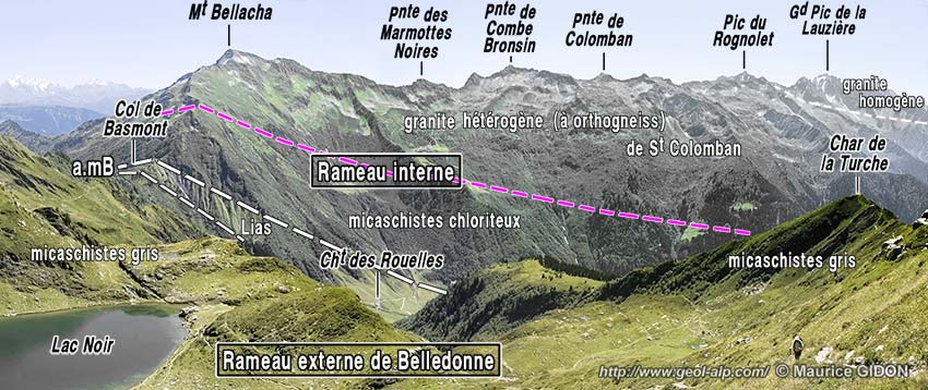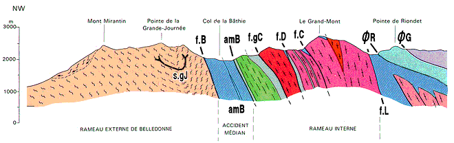 ; f.B = accident Beaufort - col de la Bâthie ; amB = accident médian de Belledonne (faille principale) . |