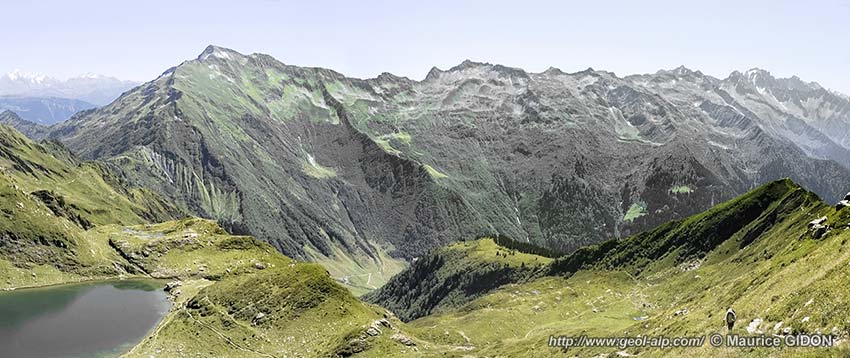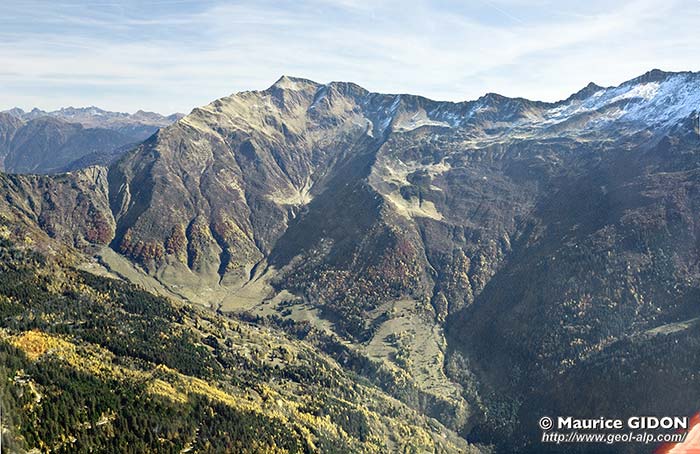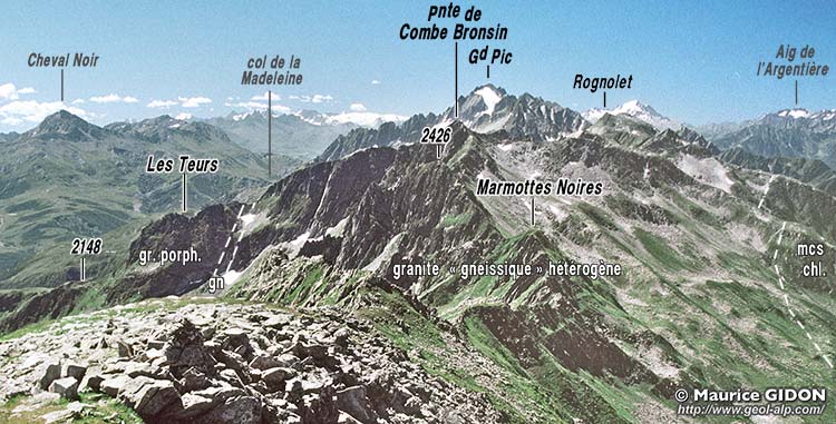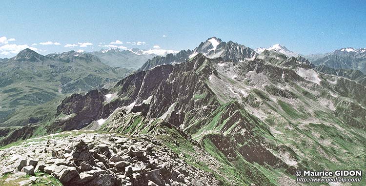 La longue crête, quasi rectiligne, de la chaîne de la Lauzière se poursuit vers le nord, depuis son point culminant, le Grand Pic, par une multitude de petits sommets qui sont tous sculptés dans la masse granitique du pluton de Saint-Colomban (voir la page "Belledonne").