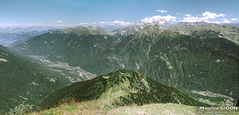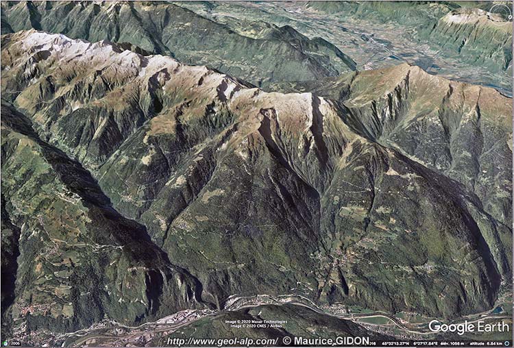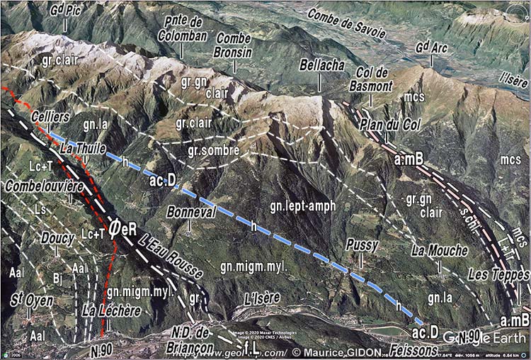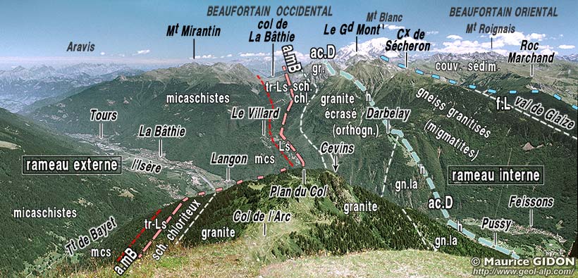 ![]() La coupe naturelle de la vallée de la Tarentaise, à l'extrémité méridionale du Beaufortain occidental, vue du sud-ouest, depuis le sommet du Mont Bellacha. Cette vue est prise peu en oblique par rapport à l'orientation de l'accident médian de Belledonne (a.mB) : c'est pourquoi la perspective décale les deux tronçons qui en sont visibles de part et d'autre de la vallée de l'Isère. Les orthogneiss de Cevins représentent le prolongement septentrional des granites de La Lauzière. Les gneiss leptyno-amphiboliques du versant oriental de ce massif se biseautent vers le nord, coupés par l'accident du Dard (ac.D) qui héberge une lame de Houiller mylonitisé. La faille de la Louze (f.L) abaisse la couverture sédimentaire dauphinoise orientale en la faisant s'appuyer, vers le haut, contre le bloc cristallin du Grand Mont. Pour plus de détails voir les pages "Mirantin" (partie occidentale) et "Comborsier" (structure de sa lèvre orientale). |