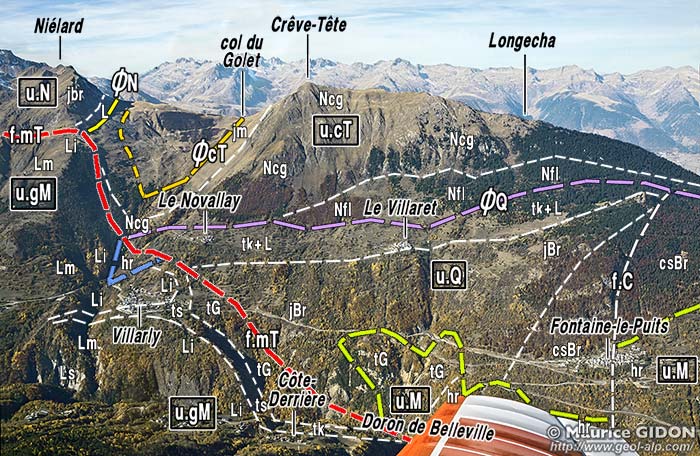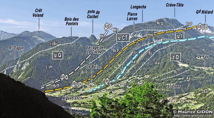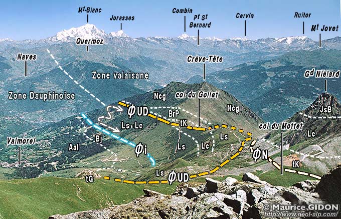 ![]() La crête de Crève-Tête, devant le Beaufortain oriental et la basse Tarentaise vue d'enfilade du sud, depuis le sommet du Cheval Noir. ØUD = chevauchement principal de la zone ultradauphinoise ; ØI = chevauchement de l'écaille intercalaire entre la zone dauphinoise et la zone ultradauphinoise ; ØN = chevauchement de la klippe* du Niélard. BrP = brèches à matériel de schistes permiens (et calcschistes à microbrèches [Dogger ?] qui les surmontent. au col du Gollet). En arrière-plan on a grossièrement indiqué la limite orientale de la zone dauphinoise, dans le secteur où la zone ultradauphinoise disparaît et se trouve relayée par la zone valaisane. |