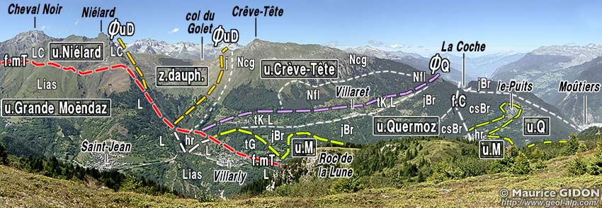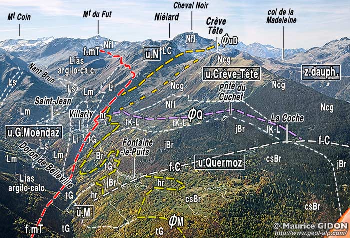 Au sein du chapelet d'unités qui s'intercalent entre le domaine dauphinois à l'ouest et le domaine briançonnais à l'est, les deux unités de Crève-Tête et du Quermoz se relaient parfaitement du point de vue géométrique, en se biseautant mutuellement et en se plaçant dans le prolongement l'une de l'autre, comme si elles n'étaient séparées par aucun accident majeur. D'ailleurs, dans le secteur du barrage de la Coche, où est censé passer l'accident N-S qui les sépare, le tracé qu'en propose la carte géologique évoque plus, sur le terrain, un faisceau de failles subverticales relativement secondaires qu'une imbrication majeure (comme ce devrait être le cas s'il séparait vraiment deux unités étrangères l'une à l'autre). Pourtant c'est bien entre ces deux unités que l'on est amené à placer la frontière majeure qui fait passer, du sud vers le nord de l'arc alpin,