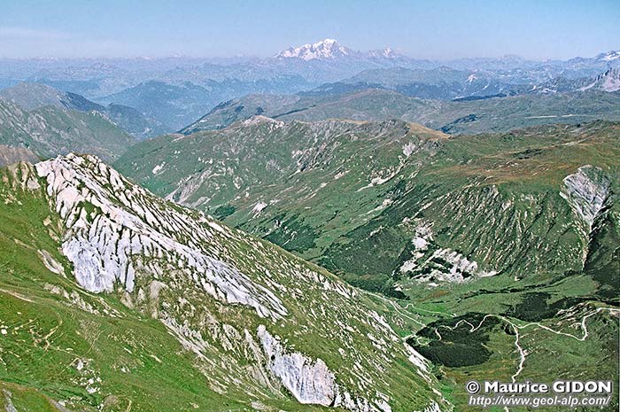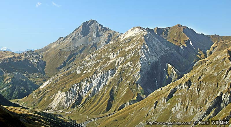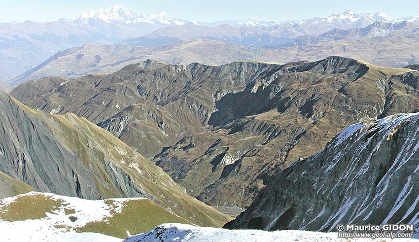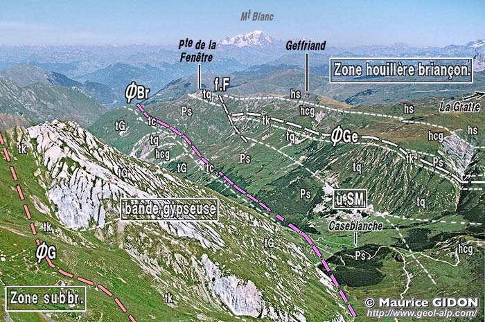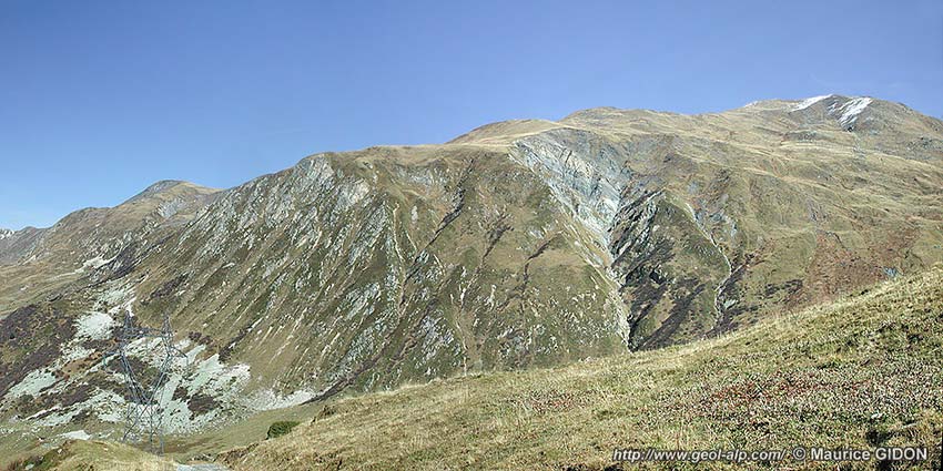 D'autre part, dès un peu au nord du sommet du Geffriand, ce versant est traversé à flanc de ses pentes supérieures par un escarpement correspondant à une bande de quartzites. Cette dernière apparaît comme le prolongement méridional de celle de la Pointe de la Fenêtre, simplement abaissée au SE de cette dernière par la faille de la Fenêtre. Cette cassure, extensive et orientée NE-SW, coupe la crête à angle aigu et se prolonge sur l'autre versant en limitant du côté ouest les quartzites de la pointe du Cochet (voir le second cliché, en début de page).