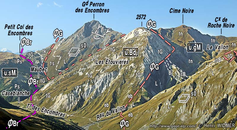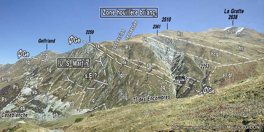 Ces couches supportent des cargneules associées à des calcaires triasiques avant d'être recouvertes par celles du Houiller : cela correspond au chevauchement du Geffriand qui marque la limite entre l'unité de Saint-Martin et le reste de la zone briançonnaise. Mais au dessus de cet accident les couches houillères se révèlent disposées à l'envers. De plus ces épais affleurements quartzitiques s'interrompent brutalement vers le sud en atteignant le ravin des Encombres. Ces deux particularités suggèrent une hypothèse qui consiste à interpréter cette bande quartzitique de La Fenêtre comme le cœur d'un synclinal des Encombres dont le flanc supérieur (oriental) serait rompu en pli-faille.