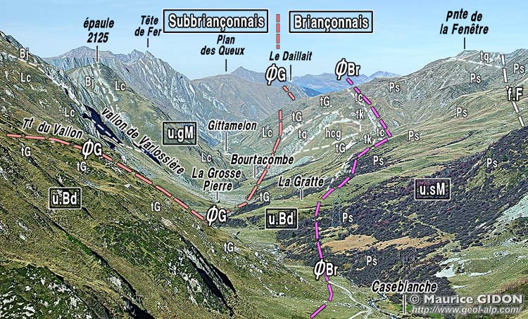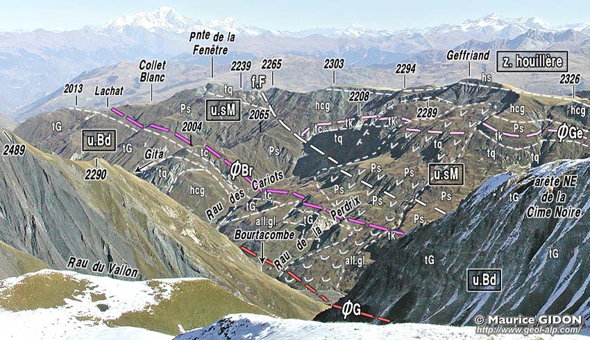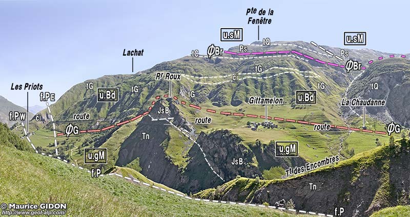 ![]() Gittamelon devant la rive gauche du bas vallon des Encombres vus du sud, depuis le hameau de la Chaudanne. a.TF = anticlinal de la Tête de Fer (cf. page "Tête de Fer") ; ØG = surface de chevauchement de la bande gypseuse frontale de la zone briançonnaise. Le Rocher Roux, qui domine Gittamelon, est formé par une brèche calcaire massive (JsB = brèche du Télégraphe) qui se prolonge en travers de la vallée et sur sa rive gauche, vers l'amont, tout au long du flanc oriental du synclinal de Varlossière (cf page Varlossière). |