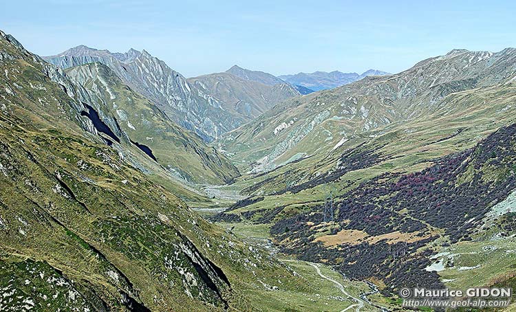 D'autre part on voit se dessiner, à l'extrémité est de la barre du Rocher Roux, un vallonnement parallèle au fond de vallée dans lequel il faut sans doute voir un ancien thalweg abandonné. Sa présence indique qu'originellement le lit du torrent devait passer là, en restant, comme plus en amont, en marge de la zone gypseuse tendre. On peut donc se demander pourquoi son tracé s'est décalé vers l'ouest, où il lui a fallu entailler la barre calcaire beaucoup plus résistante. Peut-être la cause en est elle que ce nouveau lit a été creusé à une époque où la vallée était occupée par une langue de glacier qui descendait du col des Encombres, par le torrent sous-glaciaire (dont on sait que le tracé est le plus souvent insensible à la nature des roches). |