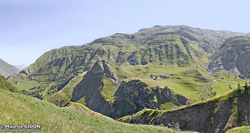 En rive droite de la vallée les pentes qui, à ce niveau descendent du sommet de Geffriand, se font remarquer par leur morphologie qui est caractéristique d'un puissant arrachement : sous la partie culminante de la crête, au sud du point coté 2289, un replat correspond au toit de la partie tassée, abaissée de près de 100 m. Il est ceinturé par une crevasse que comble de façon très typique une demi-lune d'éboulis.
