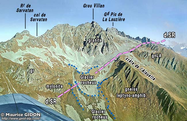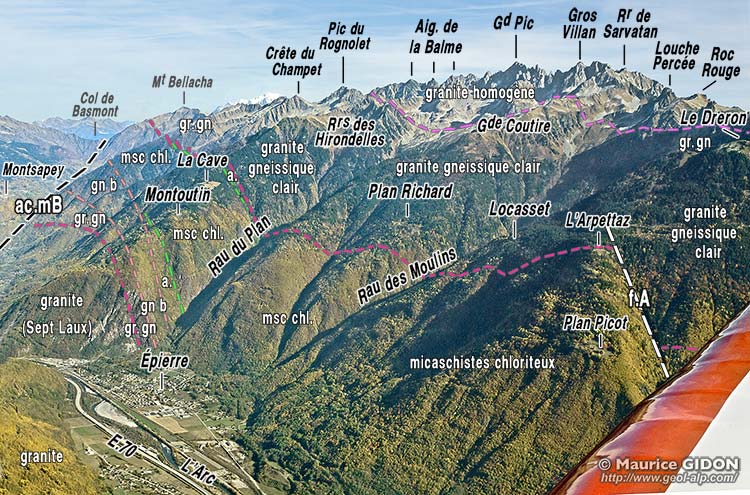 D'autre part, depuis la latitude du Gros Villan jusqu'à l'extrémité septentrionale du chaînon, la partie orientale des crêtes secondaires qui s'en détachent est constituée par une bande de gneiss amphiboliques (alternances de leptynites et d'amphibolites), qui atteint une largeur assez régulière d'environ 1500 m : elle constitue l'enveloppe du pluton granitique bien que le contact granite - gneiss y soit redressé presque à la verticale.