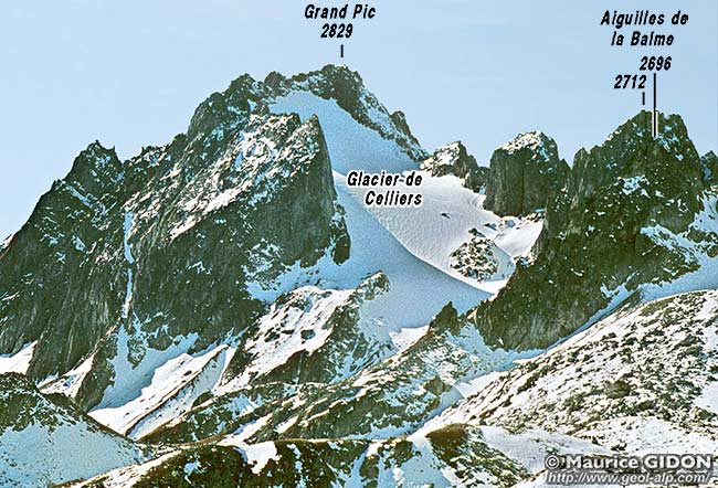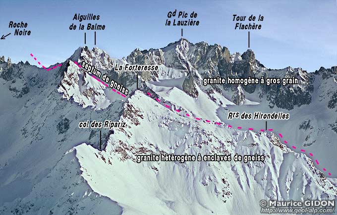 Cette bande se poursuit au nord des Aiguilles de la Balme en longeant la crête faîtière de la chaîne, en contrebas du côté oriental. Cette crête septentrionale, ainsi que les pentes du versant ouest du contrebas du Grand Pic sont constitués par une large zone de granite clair mais hétérogène, au sein duquel sont éparses des enclaves de gneiss (qui sont sans doute des orthogneiss provenant d'un écrasement du granite). Cette masse granito-gneissique est d'ailleurs séparée du granite homogène par un septum gneissique presque continu et large d'une bonne centaine de mètres).