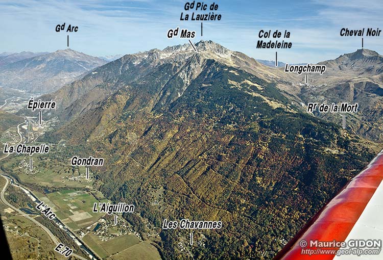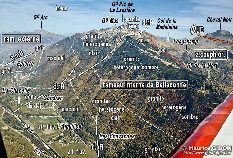 Sur cette rive de la vallée aboutit plus au sud, au village de la Girard, le grand décrochement de Saint-Rémy : le prolongement septentrional de ce dernier se manifeste apparemment en rive droite un peu au nord du village des Chavanes, où la bande des micaschistes chloriteux se termine en butant contre le granite de la Lauzière. Mais il ne semble pas que cette cassure se poursuive plus haut dans le versant, en dépit de l'important rejet qu'elle manifeste dans la traversée du massif des Sept Laux : il est donc probable que l'on observe là un relai par la faille du Roc Rouge, voire même que ces deux cassures se connectent par un raccord en baïonnette de leurs tracés grossièrement selon la limite granite - micaschistes. |