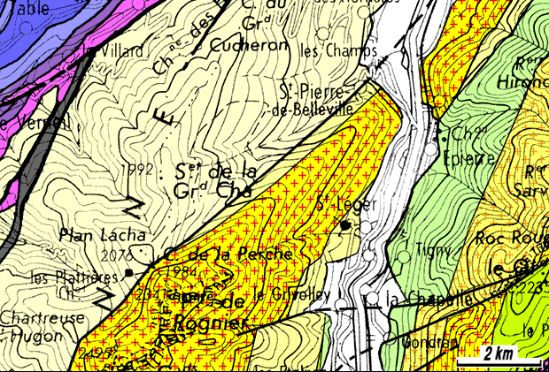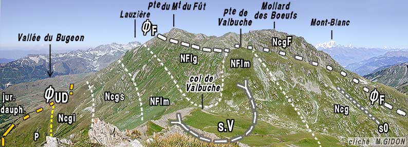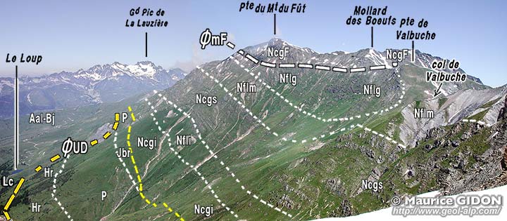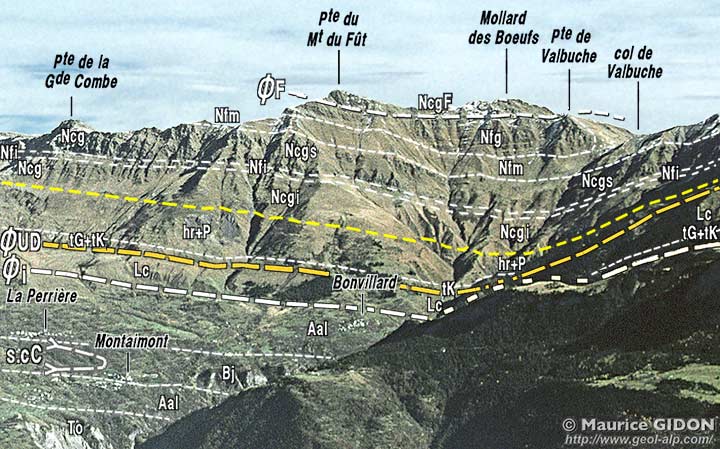 En jaune la surface de transgression du Tertiaire. ØF = chevauchement du Mont du Fût (voir remarques plus loin dans la page) ; ØUD = chevauchement de l'unité ultradauphinoise principale (des Aiguilles d'Arves); ØI = chevauchement de l'écaille intercalaire (entre autochtone et ultradauphinois) ; s.cC = synclinal de la Chal de Chaussy (voir la page "Montagne des Coins"). |