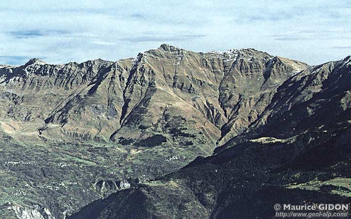 Le versant occidental de la montagne montre, à flanc de pente, le substratum de cette série, qui est constitué par une puissante lame de grès pélitiques permiens, reposant sur une semelle discontinue de grès sombres houillers. Comme à la Montagne des Coins, ce Paléozoïque* repose sur le Jurassique de la zone dauphinoise, qui forme la partie basse des pentes, par l'intermédiaire d'un coussin, ici moins épais, de gypses et cargneules.