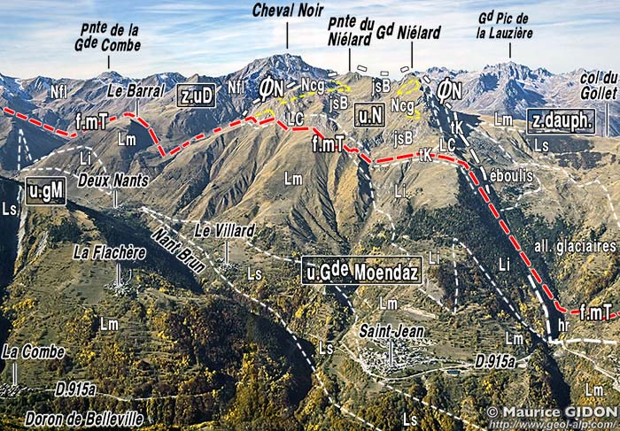 b) il est remarquable que l'unité du Niélard est limitée du côté sud-est par la cassure qui constitue le front tectonique du domaine subbriançonnais Or celle-ci sectionne franchement la surface de chevauchement de l'unité du Niélard, qui est moins fortement pentée vers l'est que lui : cette cassure représente en fait de l'extrémité méridionale de la faille de la moyenne Tarentaise (voir la page spécialement consacrée à cet accident).