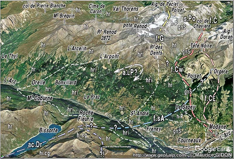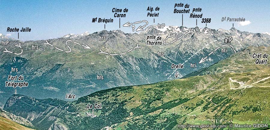 C/ Un dernier problème est relatif à la grande faille de Gébroulaz, qui se suit depuis le nord depuis Courchevel jusqu'au Col de Gébroulaz. Mais on perd sa trace au sud des glaciers de Chavière, ce qui est étonnant, compte tenu de son importance plus au nord. |