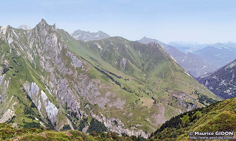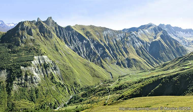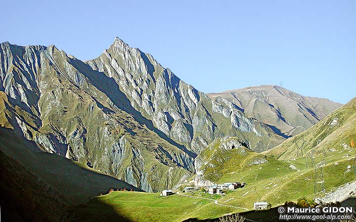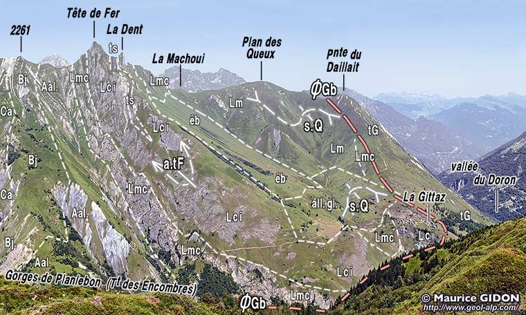 Plus au NE sur ce versant les calcaires du Lias inférieur n'affleurent plus au delà de La Gittaz où leur derniers affleurements sont tranchés en biseau par le chevauchement des gypses du Briançonnais ; à la Ponte du Daillait ces gypses reposent sur le lias moyen, également renversé et reployé (dont on suit les cœurs de Lias supérieur schisteux jusque dans le lit du Doron de Belleville (voir la page "Belleville").