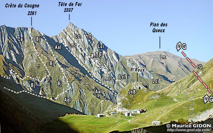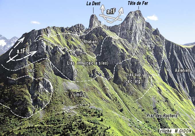 Cette géométrie correspond au fait que l'axe de l'anticlinal renversé de la Tête de Fer émerge là vers lehaut, perpendiculairement au versant. En outre cet axe semble tordu anticlinalement de façon autour d'un axe NE-SW traversant en biais la crête du chaînon (voir les schémas de charnières, même si cet aspect peut être amplifié par la sinuosité de la topographie du versant. En tous cas l'axe de l'anticlinal de la Tête de Fer est transversal par rapport à l'allongement général des plis principaux de la zone subbriançonnaise.