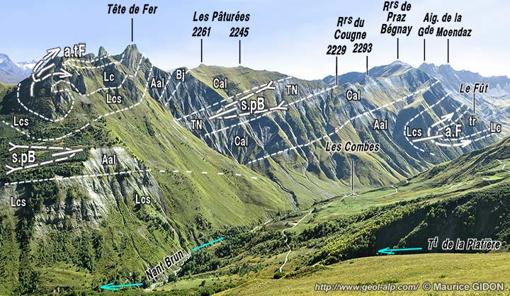 D'autre part son axe, orienté SE-NW du coté du vallon des Encombres, s'infléchit en sens horaire pour devenir N-S, conforme à la direction de la crête qui domine le Nant Brun. Enfin il y prend un plongement vers le nord supérieur à celui de la topographie car on voit sur le versant Nant Brun que le cœur de l'anticlinal de la Tête de Fer se ferme peu en contrebas du côté nord de la crête : la barre des calcaires du Lias inférieur y dessine une charnière apparemment synforme sous laquelle le Lias supérieur - Aalénien du Plan des Queux se raccorde à celui des pentes de rive droite du vallon du Nant Brun.