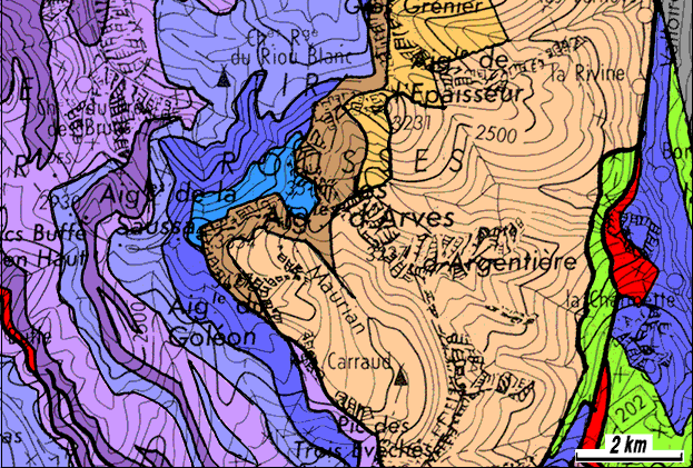On voit sur la carte schématique ci-après que le changement d'azimut de la surface limite des affleurements nummulitiques permet à son tracé de se poursuivre en contournant, plus au sud, le massif du Pelvoux par l'est, au lieu d'aller buter contre lui (si elle avait conservé l'azimut, plus que N-S, qu'elle a au nord des Aiguilles d'Arves).