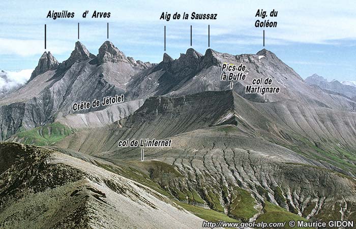 La Crête de la Buffe, qui court depuis la Cime de la Recoude par col de Martignare jusqu'à l'Aiguille occidentale de la Saussaz est une succession d'échines schisteuses sillonnées de ravines. Elle représente de façon spectaculaire le résultat de l'affrontement des érosions régressives affectant les versants opposés de l'Arvan et de la rive septentrionale de la Haute Romanche. Elle est franchement transversale aux imbrications et replis qui affectent ici le substratum jurassique de la zone ultradauphinoise, de sorte qu'elle fait ainsi alterner des arêtes N-S, argilo-calcaires ("Lias calcaire") avec de larges cols ouverts dans des schistes plus argileux (Domérien, Toarcien et Aalénien).
