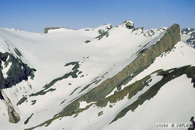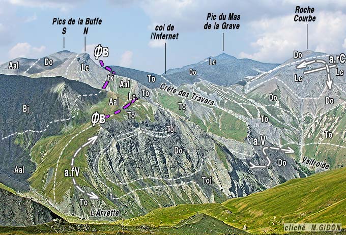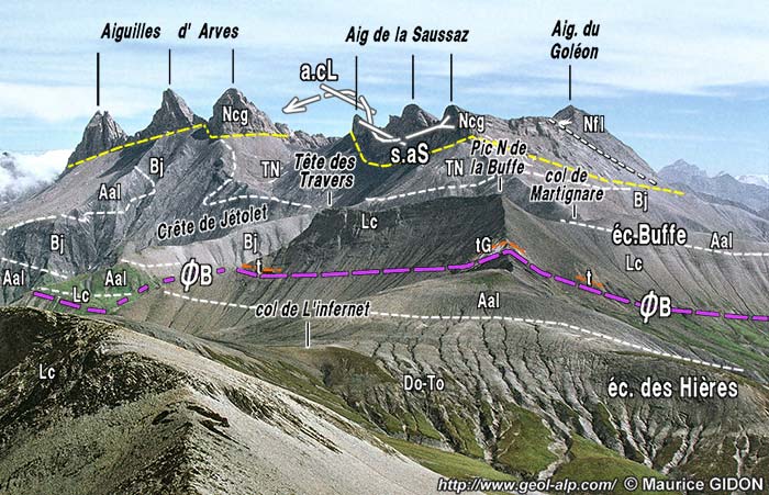 C'est ainsi que l'arête des Pics de la Buffe est formée par une barre de Lias calcaire qui constitue la base de l'écaille la plus élevée de l'édifice d'imbrications de la zone ultradauphinoise dans ce secteur, l'écaille de la Buffe.