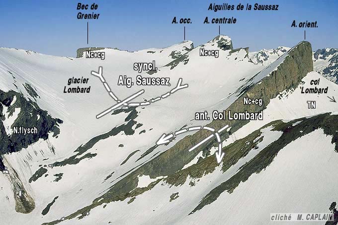 Plus précisément le changement d'azimut des strates se traduit par la forme en amphithéatre de la cuvette qui héberge le glacier Lombard : il s'agit d'un relief conforme* lié au fait que toute la pile de couches (post et anté-nummulitiques) y décrit un large synclinal des Aiguilles de la Saussaz, dont l'axe, orienté NW-SE, plonge vers le sud-est ; cette cuvette, où le synclinal est vidé de son contenu de flysch, peut donc être considérée comme une portion de val jurassien.