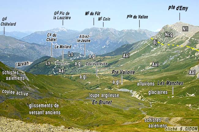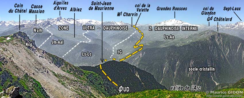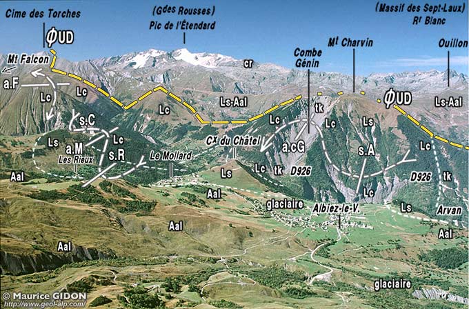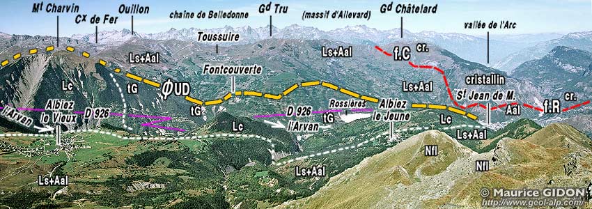 ![]() Les deux rives de la vallée de l'Arvan au niveau des Albiez, vues du sud-est, depuis Casse Massion La vue est orientée de façon perpendiculaire à la direction des principales lignes structurales (ce qui est plutôt malencontreux...). L'accident le plus important est la surface de chevauchement de la zone ultradauphinoise (ØUD). Les gypses triasiques de la base de la succession ultradauphinoise apparaissent comme autant de taches blanches (la plus grande est celle de la carrière des Rossières). f.C (faille de Cochemin) et f.R (faille du Rocheray) sont deux cassures synsédimentaires liasiques, qui se raccordent à angle droit pour limiter, du côté du sud, le bloc cristallin du Grand Châtelard. Le tracé de la D.926 (en mauve), purement indicatif, est très approximatif. |