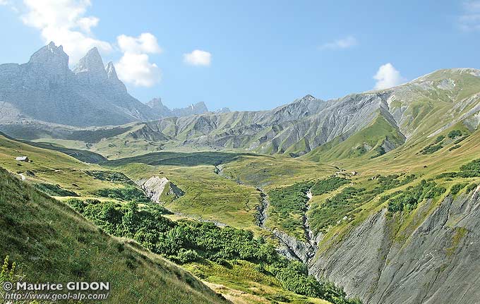 Sa rive droite est alors modelée en une large zone de replats, sur laquelle se sont installés les villages des Albiez. Ce plateau des Albiez correspond à une combe monoclinale*, orientée N-S, qui avait été ouverte dans les couches à prédominance marneuse du Lias supérieur et surtout du Jurassique moyen. Elle est dominée du côté oriental par le puissant crêt de Casse Massion et de la Point d'Émy, constitué par les conglomérats et les grès du Nummulitique. Cette combe a été élargie et façonnée par l'érosion du glacier qui descendait vers le nord depuis les Aiguilles d'Arves, puis très largement colmatée par des alluvions glaciaires (ce qui est d'ailleurs la circonstance qui a permis son exploitation agricole).