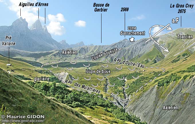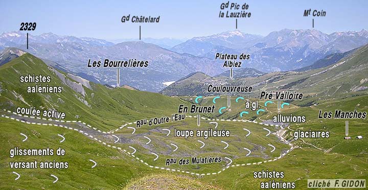 Les matériaux de ces glissements obturent maintenant le fond de vallée, au lieu-dit "en Brunet" entre les pentes de schistes des Bourrelières, à l'ouest, et le matériel morainique qui affleure encore là sur le tracé du chemin de la Basse de Gerbier, à l'est. Ils y ont édifié une typique loupe de glissement, doucement bombée mais relativement peu déclive, dont les limites sont soulignées par les deux thalwegs, qui en drainent les marges (celui d'Outre-l'eau, à l'ouest et celui des Mulatières, à l'est). Cette énorme amas boueux est coupé de ressauts qui sont autant de crevasses de glissement et qui témoignent de ce que ses matériaux sont encore en mouvement.