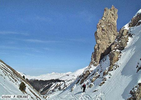 ![]() Piton de cargneules dans la combe de Bellard (cliché obligeamment communiqué par M. Pierre Verlhac) Ce détail est vu du sud, vers l'aval de la combe, selon l'axe de l'anticlinal de Bellard, à la latitude des ruines de La Culaz (alt.1850) (le personnage donne l'échelle). |
