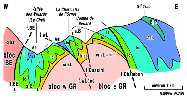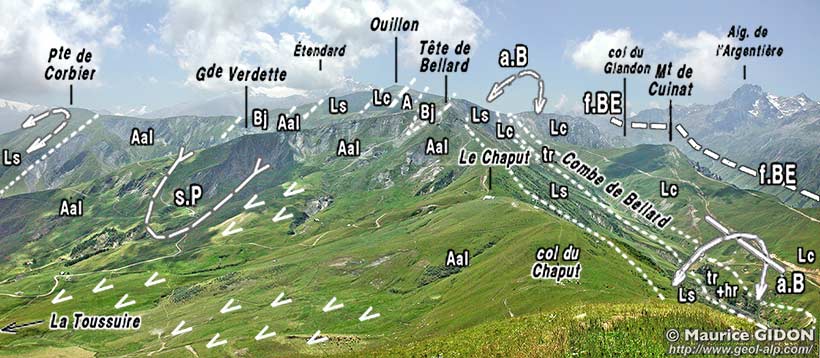![]() Le chaînon de l'Ouillon, d'enfilade vu du nord, depuis l'épaule sud (2160 m) du sommet du Grand Truc. s.P = extrémité septentrionale du synclinal (à coeur de Bajocien) du Praouat (que l'on suit de façon continue depuis la vallée du Ferrand jusqu'ici) ; a.B = anticlinal de la Combe de Bellard (sur son flanc oriental, ici à gauche, le Lias calcaire est tellement aminci, sans doute par l'effet d'une cassure secondaire, qu'il n'a pas pu être représenté) ; f.BE = faille de la bordure orientale de Belledonne. Noter l'importance de la surface occupée par les glissements en masse dans les alpages du versant gauche de la crête : ils sont favorisés par le pendage des schistes aaléniens , presque conforme à celui de la pente du versant. |