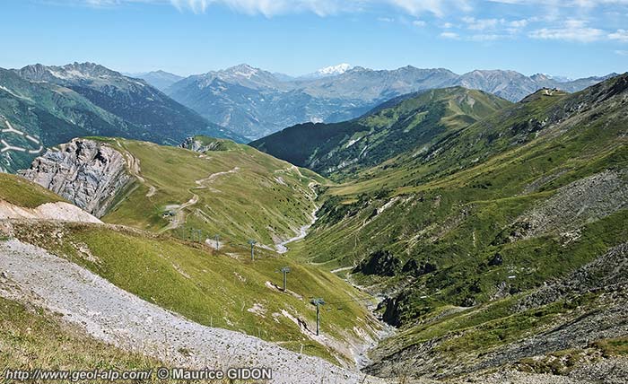 Son versant ouest forme les hautes pentes de la rive droite de la vallée des Villards en amont de Saint-Colomban. Il est, quant à lui affecté par une succession de plis et de chevauchements que la monotonie des faciès, en prédominance schisteux, et le développement des alpages rendent difficileà déchiffrer. Les abords et le versant oriental de la crête montrent les dernières traces reconnaissables des structures qui sont plus facilement analysables plus au sud, à la latitude du plateau d'En Paris. Le versant ouest correspond, quant à lui, aux prolongements structuraux de la voûte du bloc cristallin des Grandes Rousses orientales.