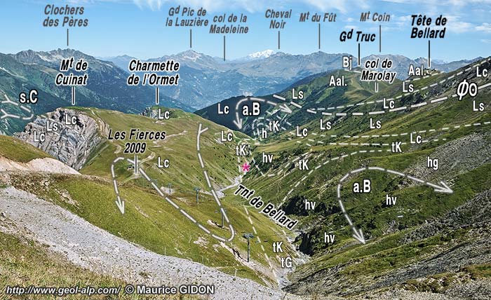 La principale de ces bandes anticlinales correspond à la couverture du bloc des Grandes Rousses occidentales ; elle est éventrée dans le sens de l'axe du pli par la Combe de Bellard dont le fond est garni de pitons ruiniformes caractéristiques du Trias supérieur. Toutefois le cœur du pli, formé de houiller (grès et orthophyres) affleure en bas des pentes du versant est de la Combe de Bellard.