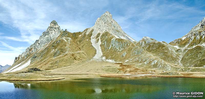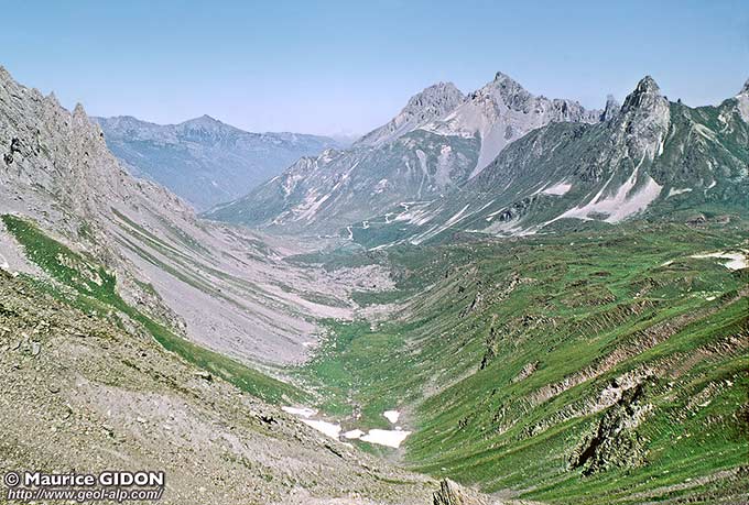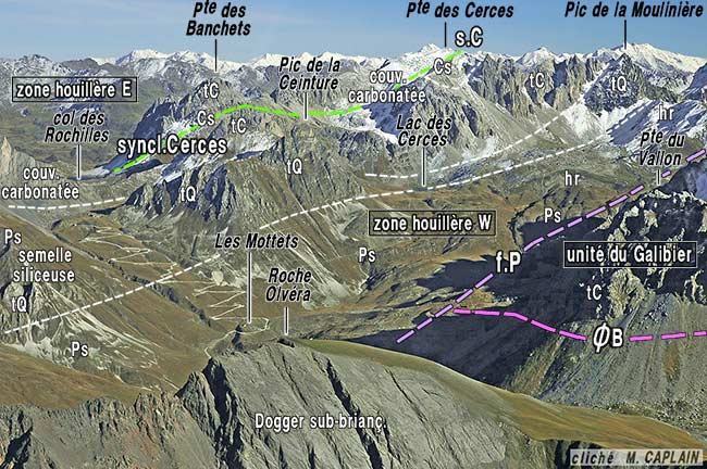Mais, du point de vue géologique, les montagnes situées au sud, en direction du col de la Ponsonnière et à l'est formant la crête septentrionale des Cerces, au sud du col des Rochilles, se rattachent franchement au Briançonnais (se référer par conséquent au généralités de cette section).