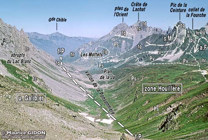 Cette importante cassure a très généralement été considérée comme un chevauchement de la zone houillère sur l'unité du Galibier. Mais son pendage est très redressé et l'on constate même, à la latitude des Mottets, qu'elle sectionne la surface, beaucoup moins pentée, du chevauchement de l'unité du Galibier : or cette dernière devrait au contraire s'enfoncer sous le permo-houiller briançonnais s'il n'y avait là qu'une simple imbrication de chevauchements |