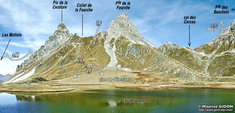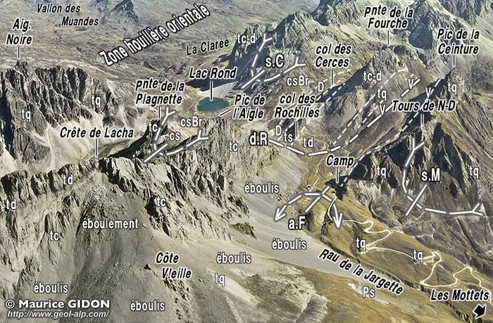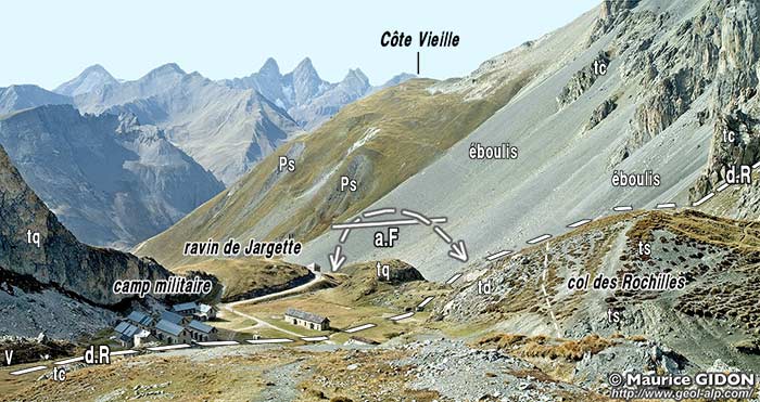 ![]() Le versant ouest du col des Rochilles, vu de l'est depuis l'arête sud du col. a.F = anticlinal de La Fourche ; d.R = décrochement du col des Rochilles. |