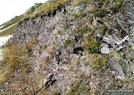 Un affleurements de "schistes des Mottets", le long de la route du camp des Rochilles, immédiatement au dessus des chalets des Mottets. |