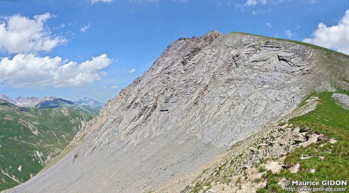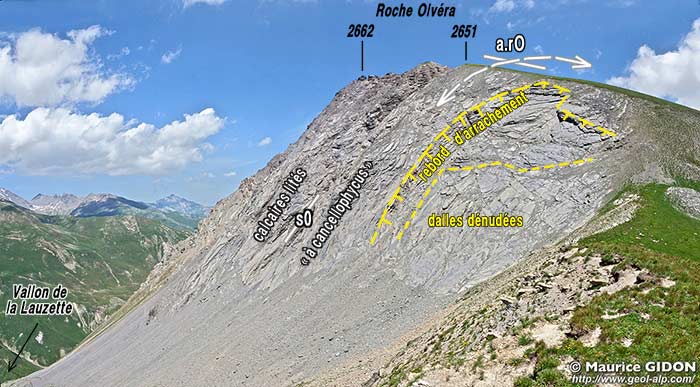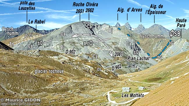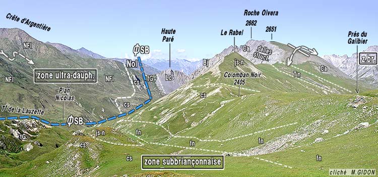 ![]() Le versant méridional de la Roche Olvera, vu du sud, depuis les pentes septentrionales du col du Galibier (point d'altitude 2450 sur la D 902). La crête Qui mène au col du Galibier par le Rabel et le col du Colomban Noir donne une coupe continue de la succession stratigraphique du flanc ouest de l'anticlinal de La Roche Olvéra : elle est du type subbriançonnais "épais", plutôt proche de celui de la Grande Moëndaz (voir la colonne stratigraphique). On a indiqué le plongement de l'axe du pli à la voûte des calcaires du Jurassique moyen. ØSB = chevauchement basal de la zone subbriançonnaise ; Nol = olistostrome du sommet de la succession nummulitique ; Ca = calcaires lités du Callovien (partie supérieure des calcaires du Dogger). |