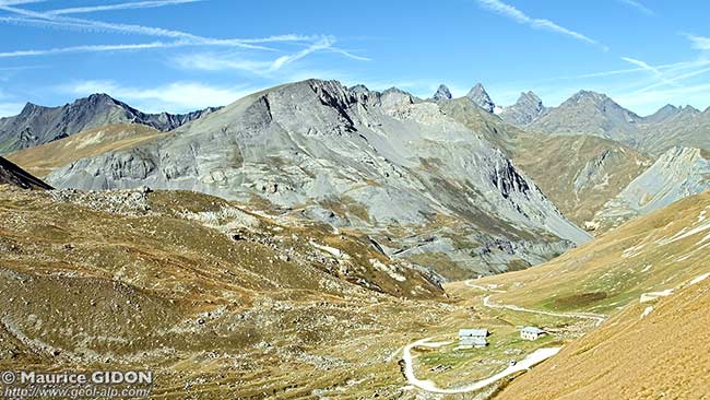 Ce puissant coussinet gypseux se poursuit aussi plus au sud par le col du Galibier. Il repose, comme au nord de Valloire, sur un ensemble peu ordonné de panneaux rocheux qui sont essentiellement formés de flysch noir et de marbres en plaquettes, c'est-à-dire de matériel briançonnais ou subbriançonnais, en tous cas ne provenant pas de la zone ultradauphinoise.