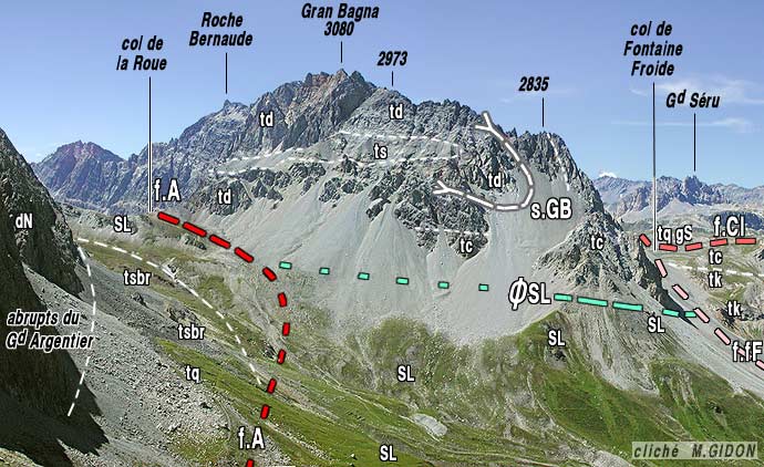 Toutefois on peut aussi envisager que le contact entre l'unité de Gran Bagna et les schistes lustrés soit plutôt une branche de faille prolongeant celle des Acles vers le nord jusqu'à la connecter avec celle de Fontaine Froide (voir la carte schématique ci-après) : les affleurements sont insuffisants pour trancher entre ces deux interprétations. |