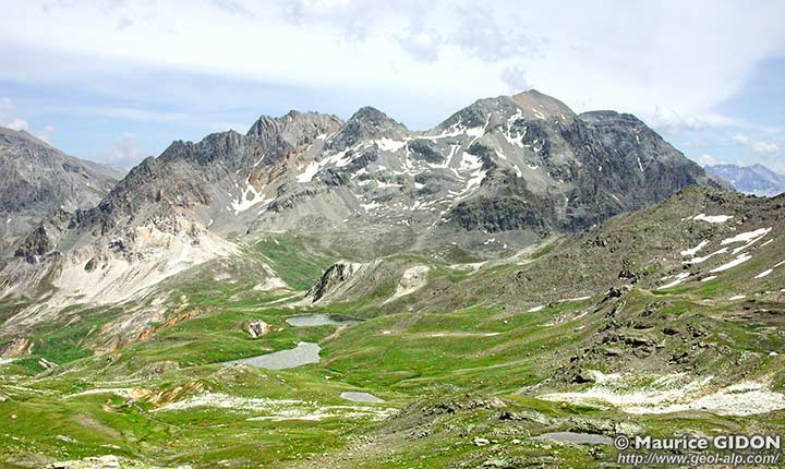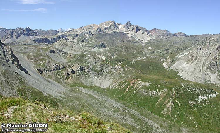 Les hauts vallons confluents du torrent du Charmaix (qui se jette dans l'Arc à Modane) drainent vers le nord le versant septentrional de la crête de partage des eaux entre le bassin de l'Arc et celui de la Doire Ripaire. Cette crête court d'ouest en est depuis le Mont Thabor jusqu'au sommet du Grand Argentier en passant par le col de la Vallée Étroite, la cime de Gran Bagna et le col de la Roue. Elle est dans son ensemble orthogonale aux structures qui s'imbriquent sur cette transversale, ce qui conduit à y observer une coupe naturelle qui est décrite ci-aprés dans ce sens.
