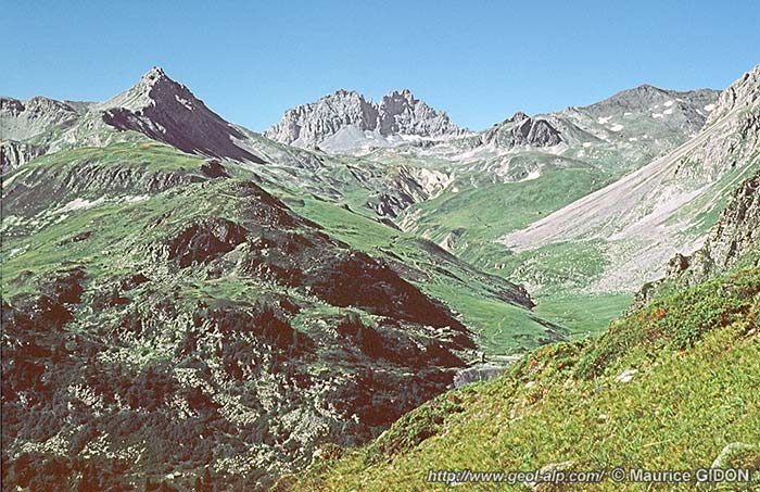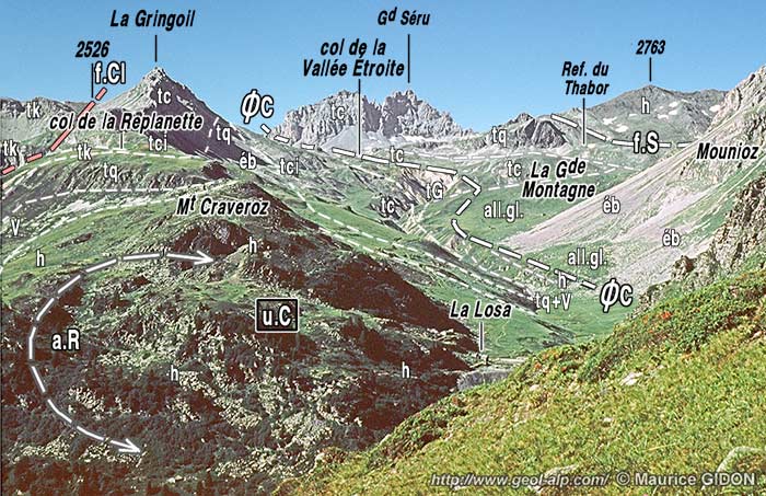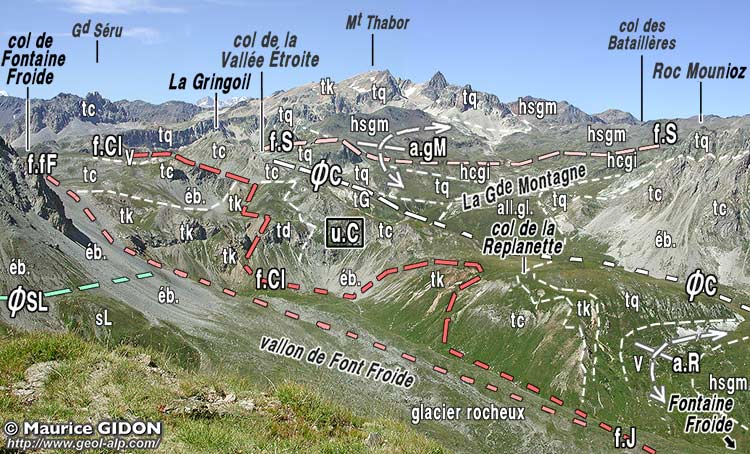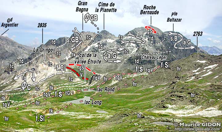 ![]() Les abords du col de la Vallée Étroite, vus du nord-ouest, depuis le col des Bataillères (le refuge du Thabor est masqué derrière le verrou du Lac Rond). La partie située en arrière du col de la Vallée Étroite est également étudiée à la page "Roche Bernaude" ØC = chevauchement de l'écaille des Clos (voir la page "Sarrasins") ; f.S = faille du Séru ; f.Si = branche intercalaire de la faille du Séru. La faille de la Clarée (f.Cl) disparaît vers la gauche, derrière la crête de La Gringoil ; elle est partagée en deux branches entre lesquelles affleure une lame de gneiss du Sappey (notée gS) et de Verrucano. |
